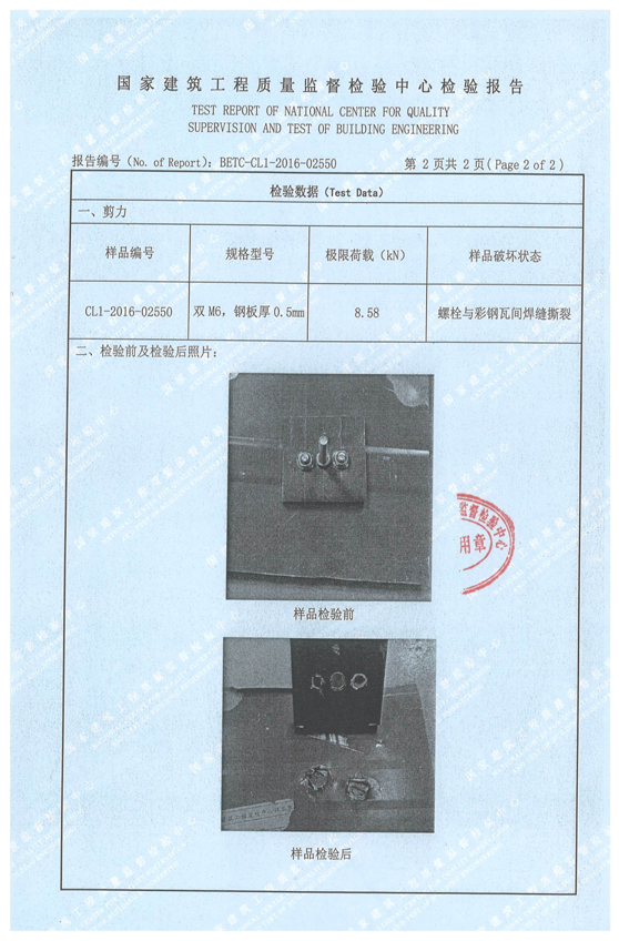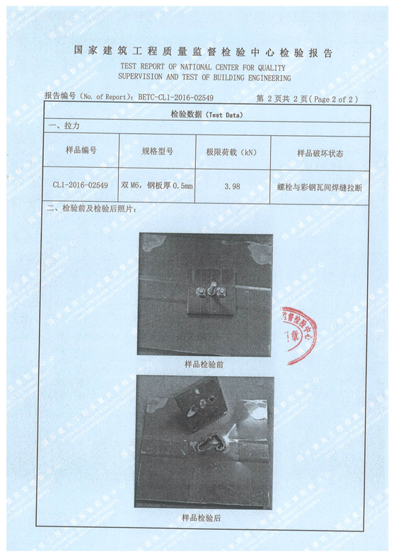 專用焊接螺栓焊接荷載己經過中國國家建筑工程質量監督檢驗中心的檢測。根據力學計算,在38.9m/s颶風時,作用在光伏組件上的風壓為570N, 新型支架焊接連接點的極限拉力荷載為:4020N, 極限剪力荷載為:6320N,己大大超過其理論設計值。
