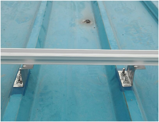 傳統的方案,在夾具與梯形彩鋼瓦瓦楞之間放置防水膠條或涂刷防水膠后在打孔加螺栓或鉚釘或強力膠粘接的連接方式,有施工工序復雜 , 使用的零部件多 , 施工時間長以及原材料成本高的問題。還有因彩鋼瓦的型號較多,各型號的彩鋼瓦瓦楞截面尺寸各異 , 各型號彩鋼瓦的夾具基本不能通用,使得彩鋼瓦屋面光伏支架結構在安裝過程中裝配復雜,每種彩鋼瓦需要根據其截面形狀生產相應截面形狀的夾具,夾具生產所需模具較多,增加了生產成本.
