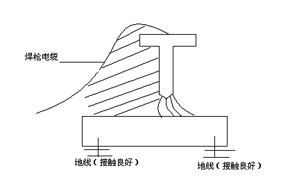 接地端在生產(chǎn)過(guò)程中總是預(yù)先接好,在焊接過(guò)程中,由于工件慢慢被磁化,將發(fā)生電弧向接入端的另一面偏移。此時(shí)應(yīng)盡早接入另一根規(guī)格相同的地線,長(zhǎng)度相同,以防止工件被磁化而發(fā)生磁偏吹。如下圖2-1所示: